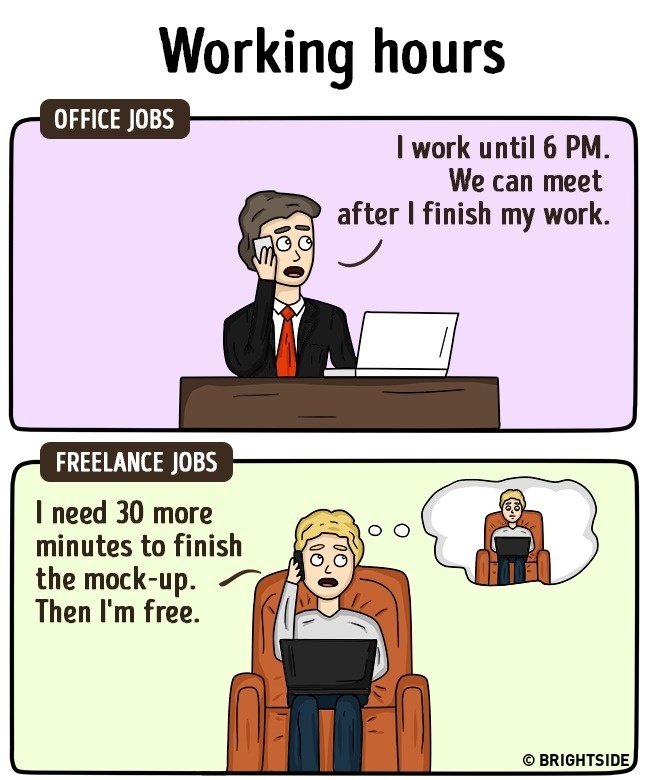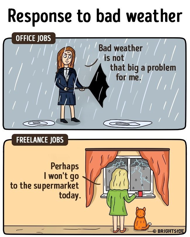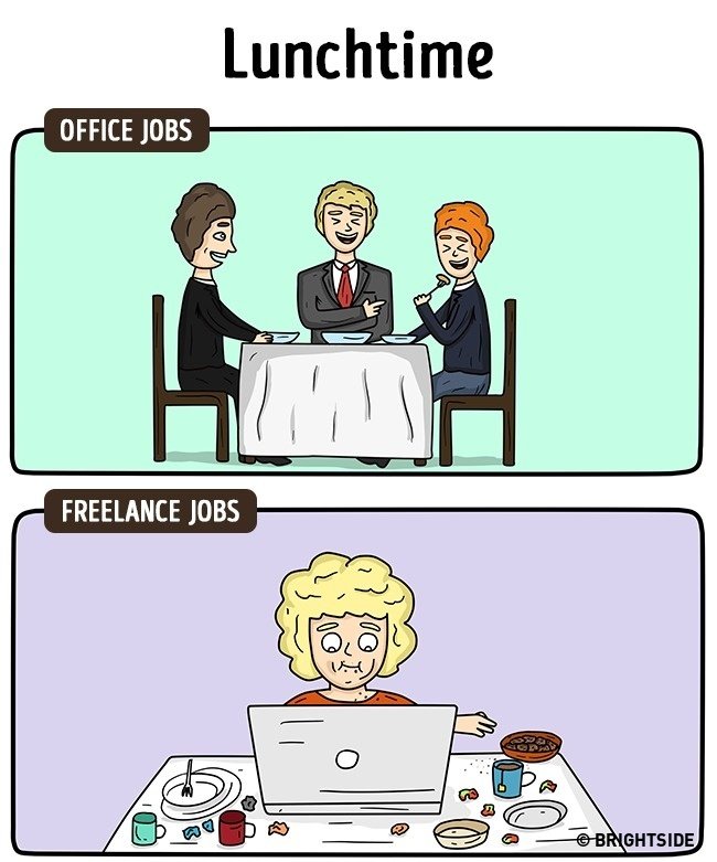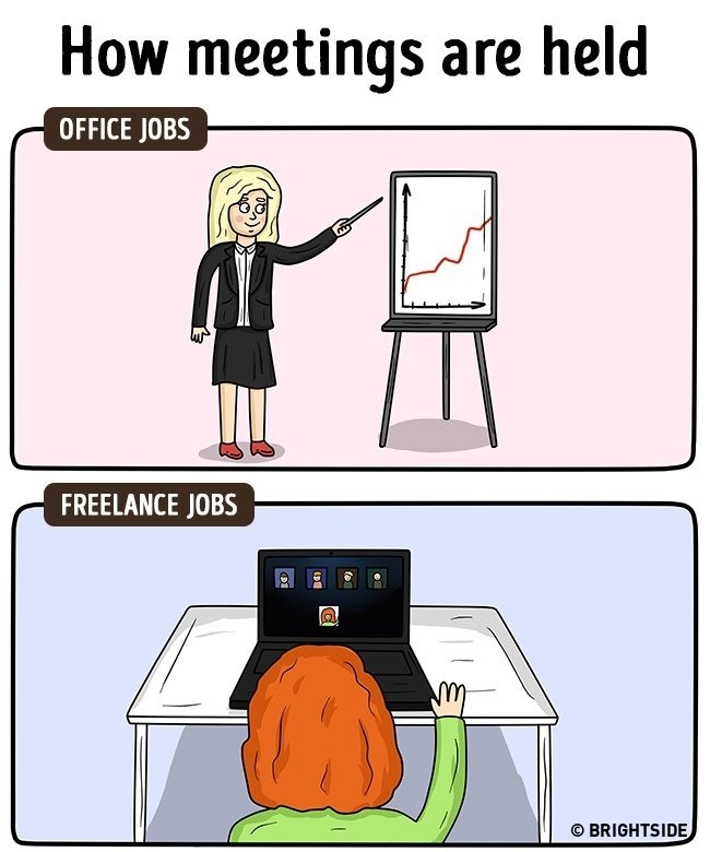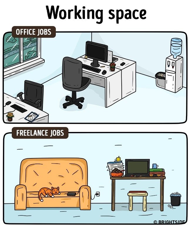 Nemrég pont arról írtam, hogy én hogyan éltem meg a változást, amit az otthoni munka jelentett. Ez tényleg szabadság – bár az én esetemben azért jár némi járkálással a dolog 😛 De tény: egy szál laptoppal dolgozni, hihetetlen érzés! Íme néhány kép, az irodai munka és az otthoni munka közti különbségeket mutataja be: